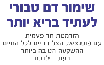 - המרכז המוביל בישראל לשימור דם טבורי עם ניסיון של למעלה מ-20 שנה, מציע טכנולוגיה מתקדמת, צוות מומחים ושירות מתקדם בכל חלקי הארץ.